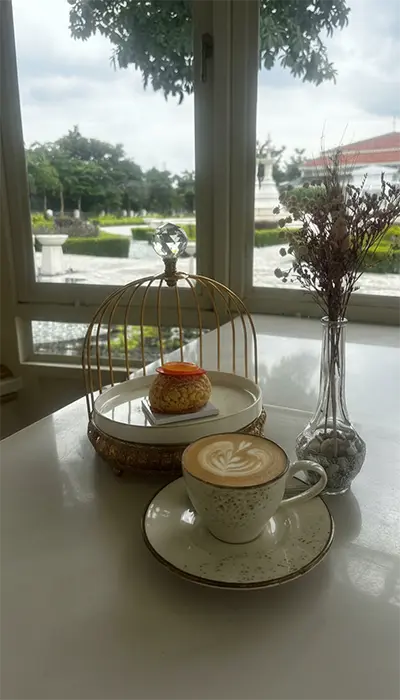 Di sesi yang kami ambil (pukul 15:30 – 17:00), suasana terasa sangat privat. Hanya ada empat meja yang terisi. Salah satunya adalah satu keluarga warga negara asing yang tampak baru saja selesai melakukan tur istana. Suara denting sendok yang beradu dengan cangkir porselen dan suara air mancur dari kejauhan menciptakan simfoni yang sangat menenangkan.